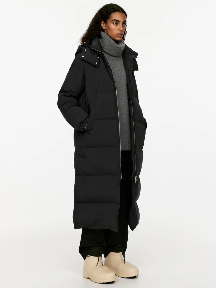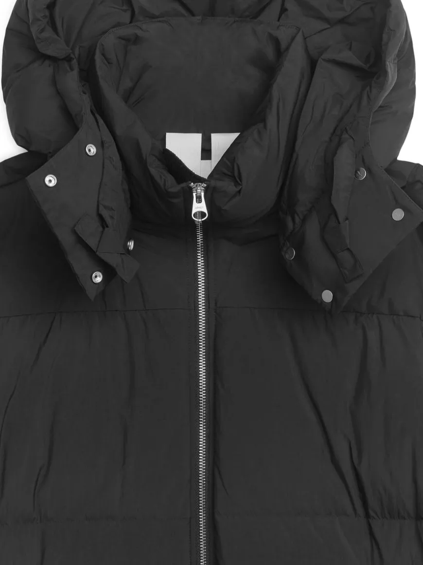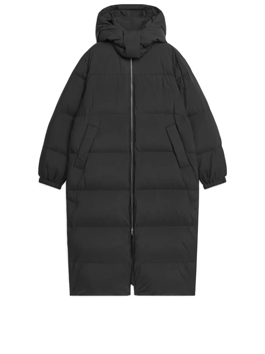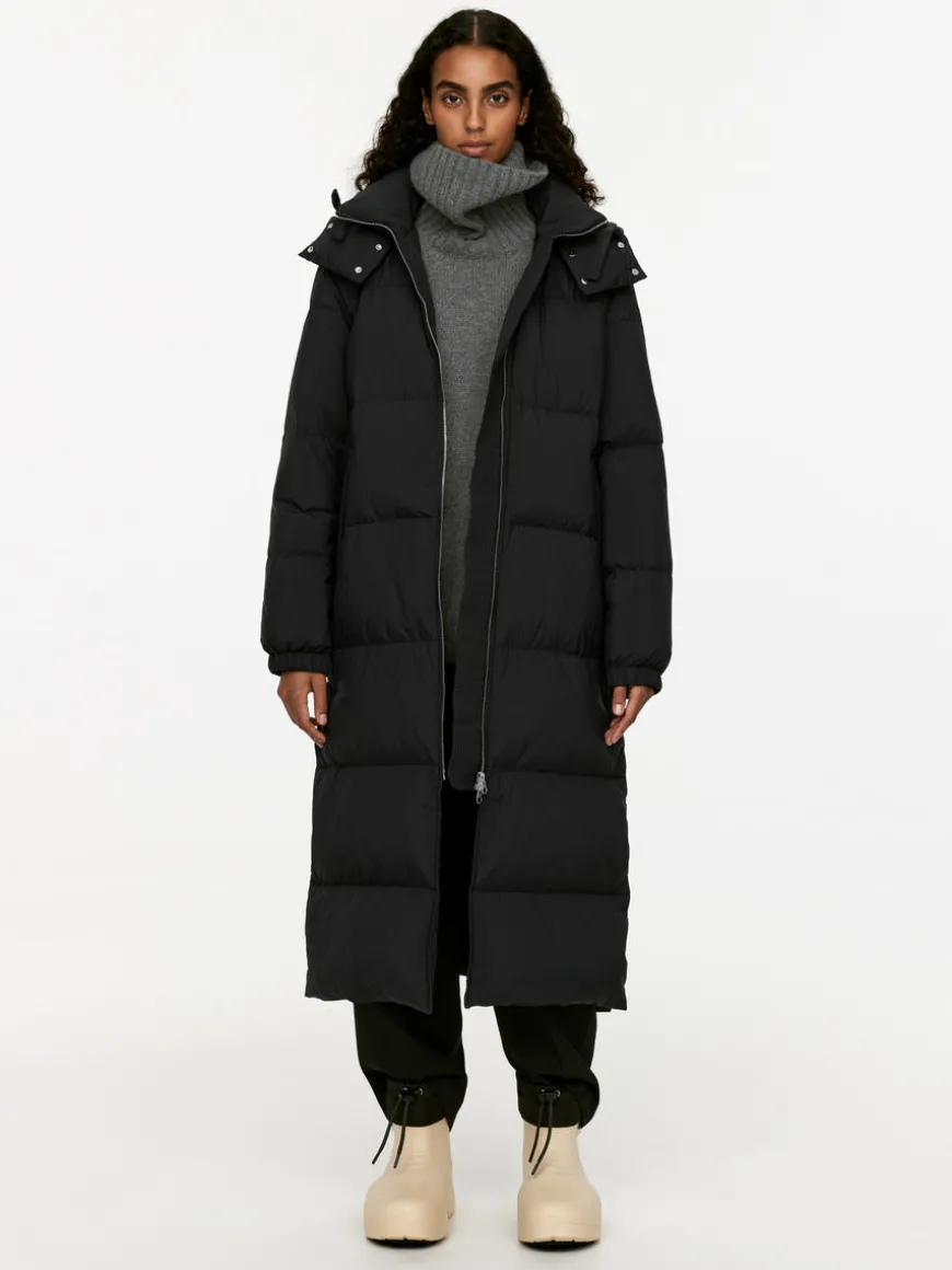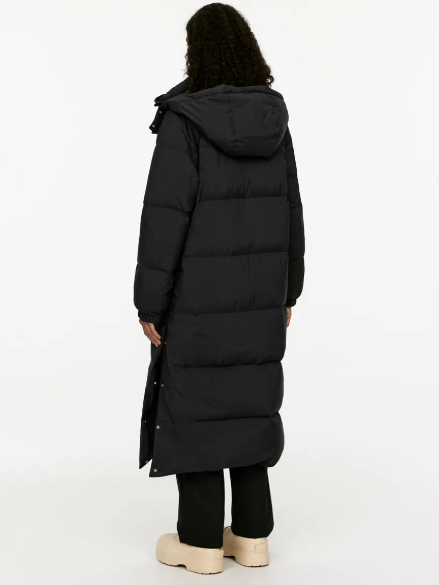 Long, hooded coat filled with a warming blend of down and feathers. Detachable hood with snap buttons and drawstring. The coat has a two-way zip at front, slanted pockets with snap button closure and a single inner pocket. Slits with snap buttoning at side seams. Fill power of 650cuin – the higher the number, the better the insulation. The Upcycled Down products are filled with recycled down and feathers sourced from Re:Down®. These materials, collected from used textiles, are washed and sterilised at high temperatures without the use of chemicals.