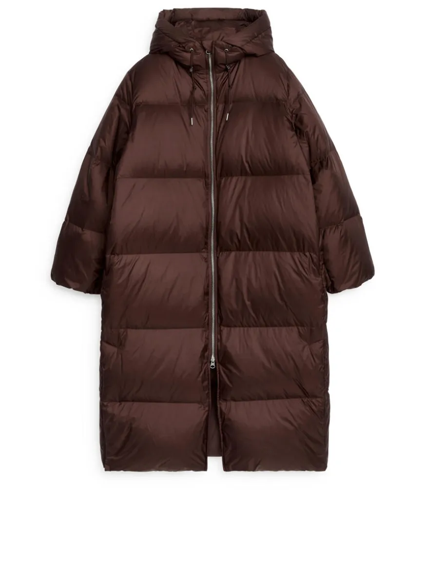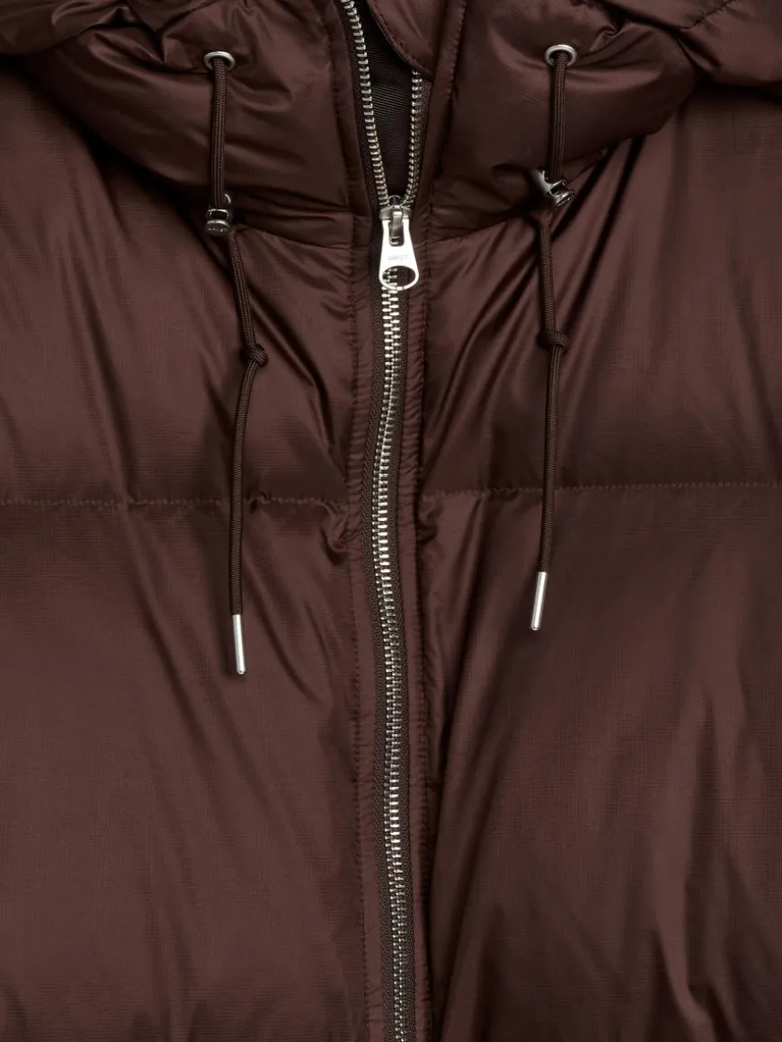 Long coat filled with a blend of down and feathers. A hooded style with zip closure at front and hidden side slits with snap buttons. Side pockets with zip closure. The Upcycled Down products are filled with recycled down and feathers sourced from Re:Down®. These materials, collected from used textiles, are washed and sterilised at high temperatures without the use of chemicals.
