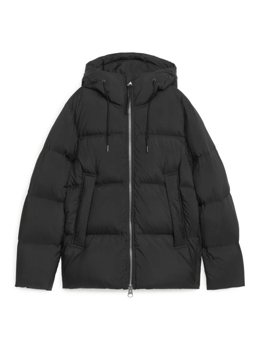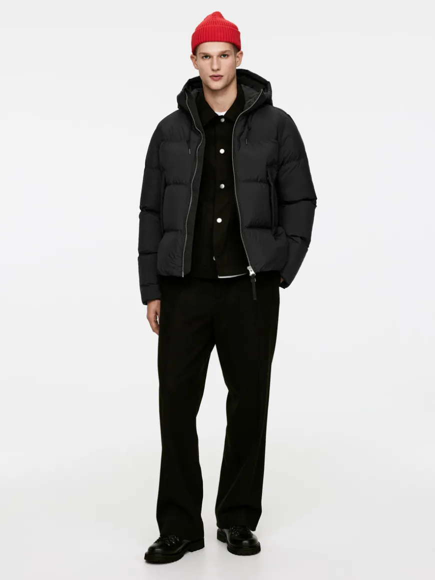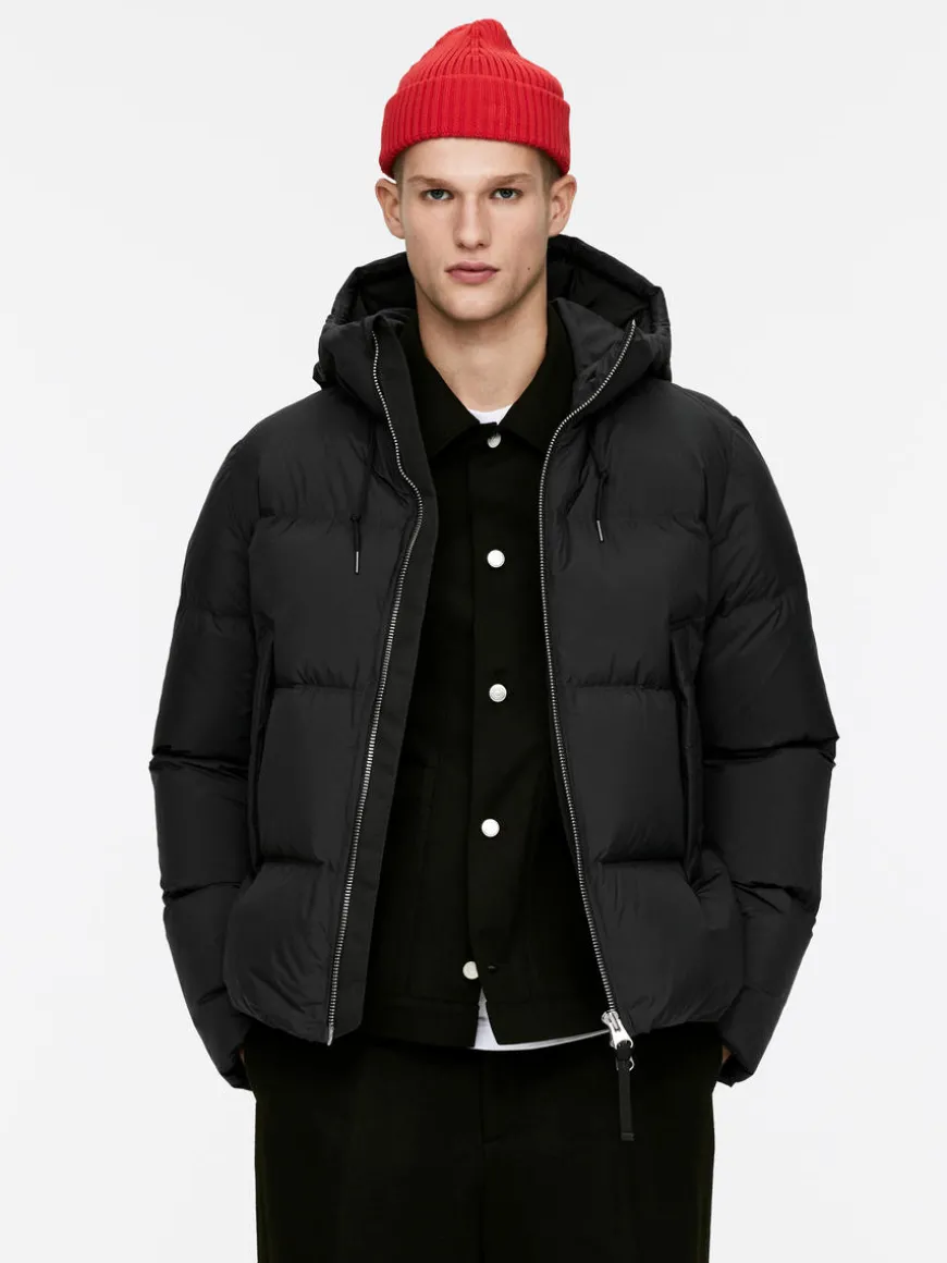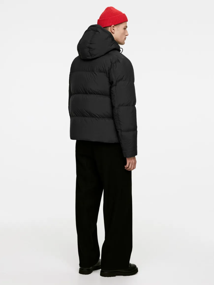 Mid-length quilted jacket filled with a blend of down and feathers. This style offers excellent insulating comfort in dry and cold weather. Featuring a hood with drawstring and zip closure at front with a zip guard underneath. The elastic bindings at the cuffs and bottom hem help to protect from cold wind. Welt pockets with hidden snap buttons. Two inside pockets, one with zip and one with snap button. The Upcycled Down products are filled with recycled down and feathers sourced from Re:Down®. These materials, collected from used textiles, are washed and sterilised at high temperatures without the use of chemicals.