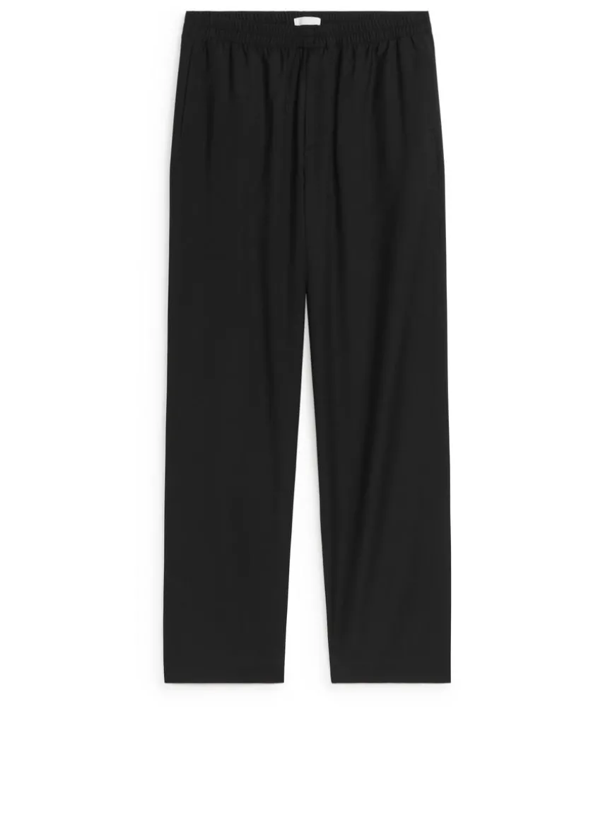 Wide-fitted summer trousers crafted from pure wool. Styled with side pockets, patch pockets at back and drawstring at waist. Zip fly. The shell fabric contains 100% RWS wool, certified by control union 893290. Products certified to the Responsible Wool Standard (RWS) contain wool fiber from farms independently certified to animal welfare and land management requirements.