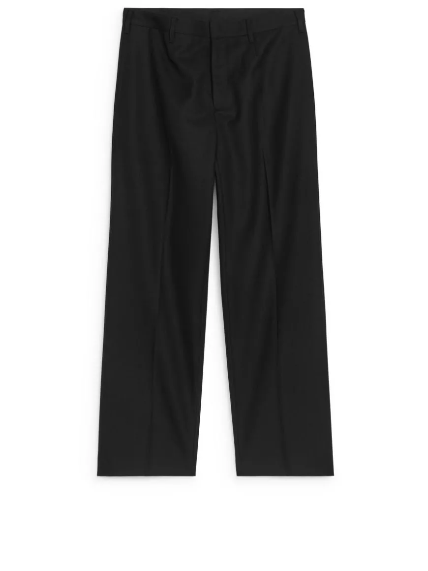 Tailored wool trousers with wide, straight legs and front creases for a more dressed look. Featuring side-seam pockets and buttoned welt pocket at back. Zip fly.