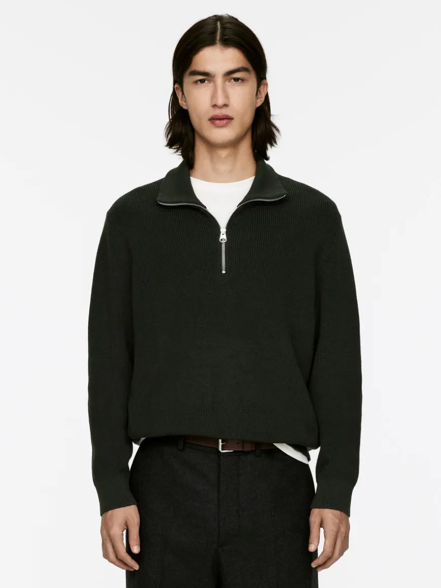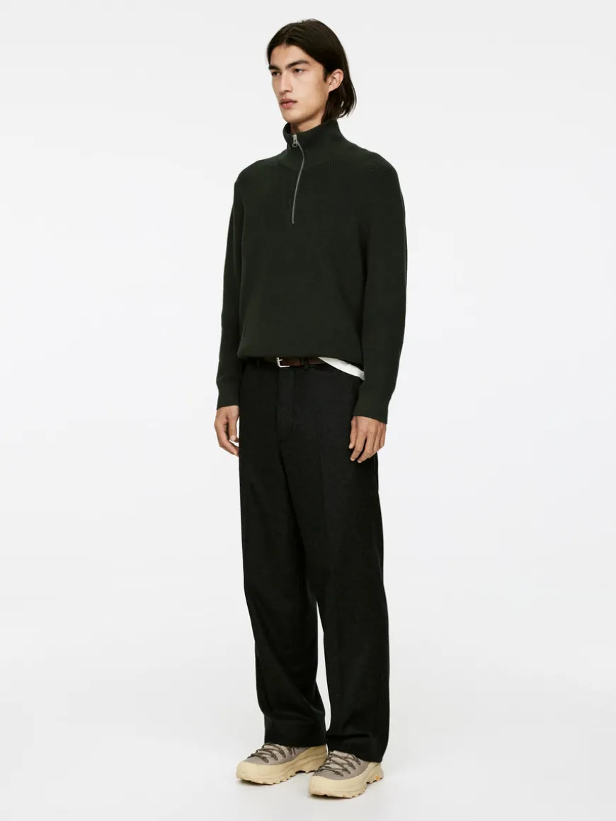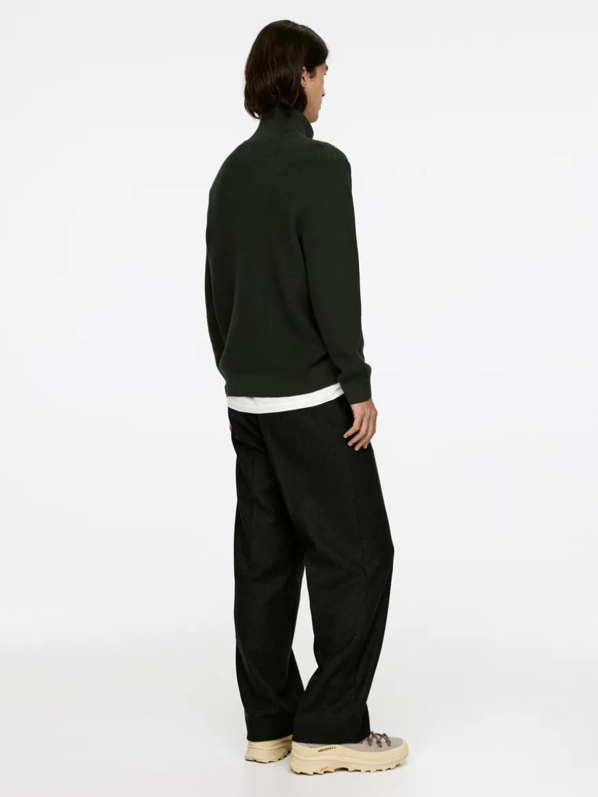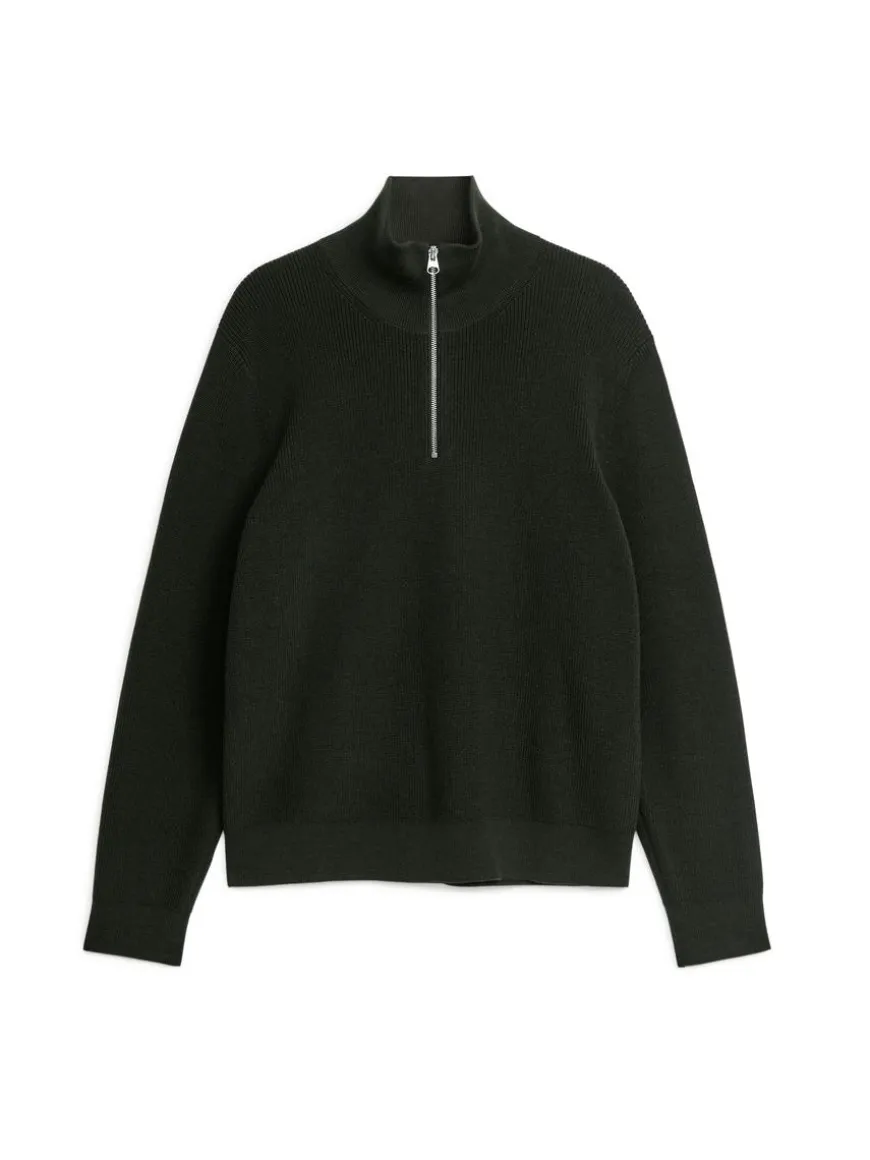 Jumper with a slightly dry feel to the touch, made in a blend of raw wool and cotton. ARKET’s Raw wool™ yarn is spun from extra-strong and slightly coarser-than-normal wool fibres. The dry feel softens with time as the fibres naturally become smoother and more pliable. The jumper is knitted in a half-cardigan stitch and features a high collar with a half zip. Ribbed trimmings. 12 gauge. The jumper contains 69% RWS wool, certified by control union 1244999. Products certified to the Responsible Wool Standard (RWS) contain wool fiber from farms independently certified to animal welfare and land management requirements.