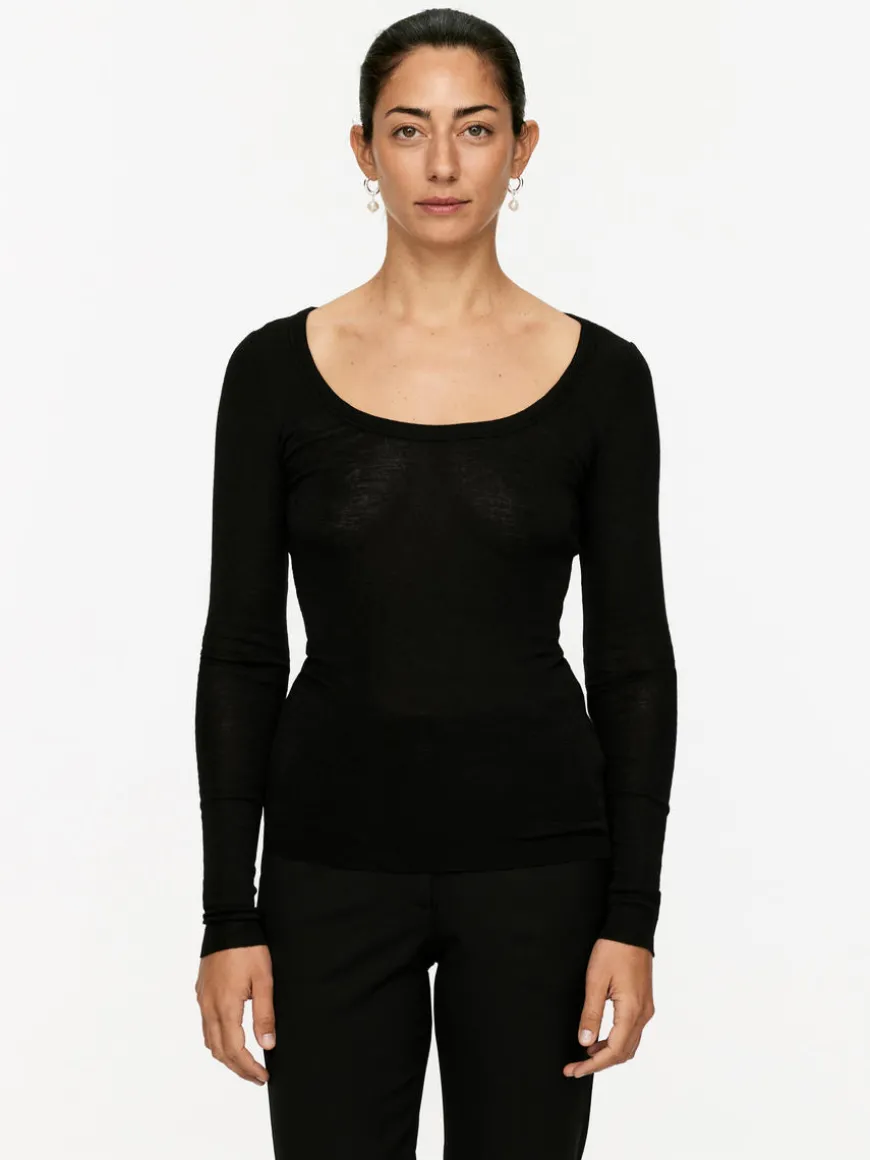 Rib-knitted top crafted from wool. A slim-fitted style with a scooped neck. The top contains 100% RWS wool (TE-00047206). Products certified to the Responsible Wool Standard (RWS) contain wool fiber from farms independently certified to animal welfare and land management requirements.